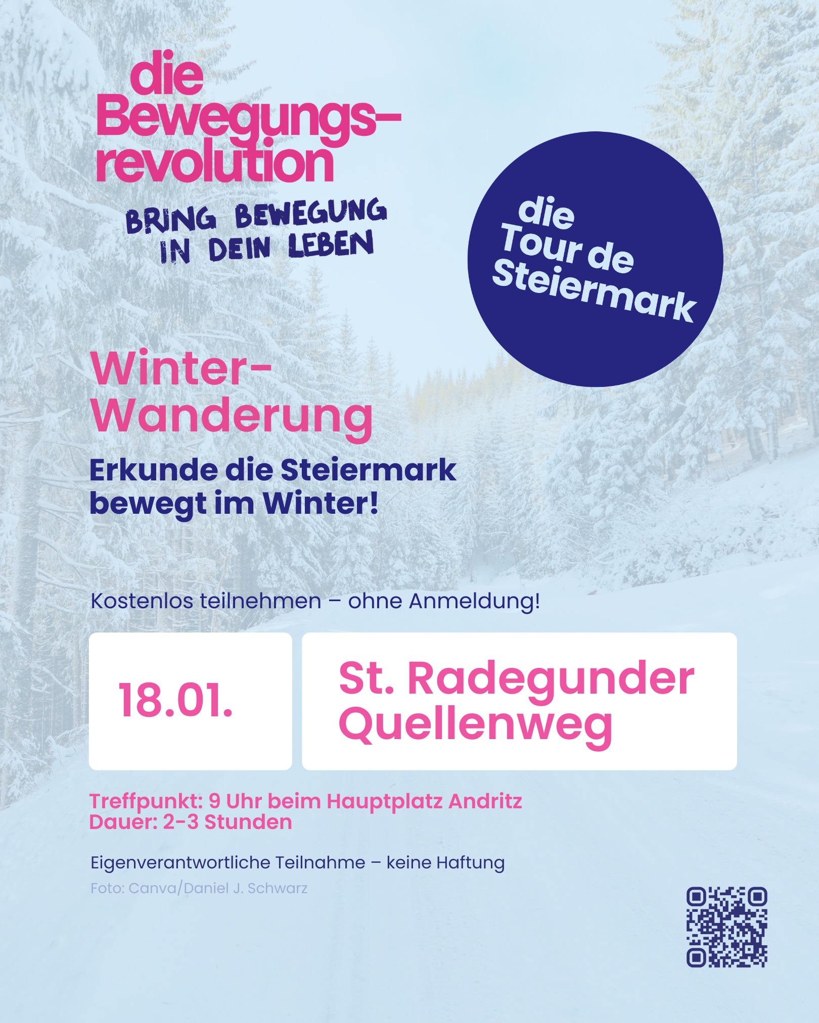 Bewegung, Natur und frische Winterluft: Am 18. Jänner lädt die Bewegungsrevolution im Rahmen der Tour de Steiermark zu einer gemeinsamen Winterwanderung ein.